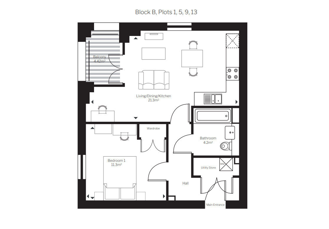 Upon entry to the apartment, there is a built-in utility cupboard off of the hallway with a washer/dryer and additional room for personal storage. The double bedroom benefits from a built-in wardrobe providing additional storage solutions. The sleek bathroom has a shower over the bath.
